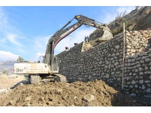 Antalya Büyükşehir Belediyesi, Kırsal Hizmetler Dairesi Başkanlığı ekipleri heyelan meydana gelen grup yollarının güvenliğini arttırmak için duvar çalışması yapıyor.