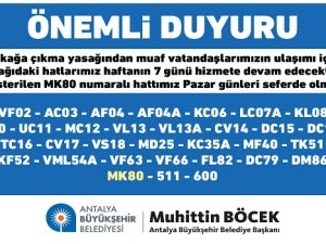 Büyükşehir Belediyesi Ulaşım Planlama ve Raylı Sistem Dairesi Başkanlığı’ndan yapılan açıklamaya göre; VF01,VF02, AC03, AF04/A, KC06, LC07A, KL08, LF09, LF10, UC11, MC12, VL13/A, CV14, DC15/A, TC16, CV17, VS18, MD25, MK80, KC35A, MF40, TK51, KF52, VML54A, VF63, VF66, FL82, DC79, DM86, 511 ve 600 levha numaralı ana ve gövde hatlar tam kapanma günlerinde seferlerine devam edecek. İlk seferine 06.00’da başlayacak olan toplu ulaşım araçları son seferini 22.00’de yapacak.