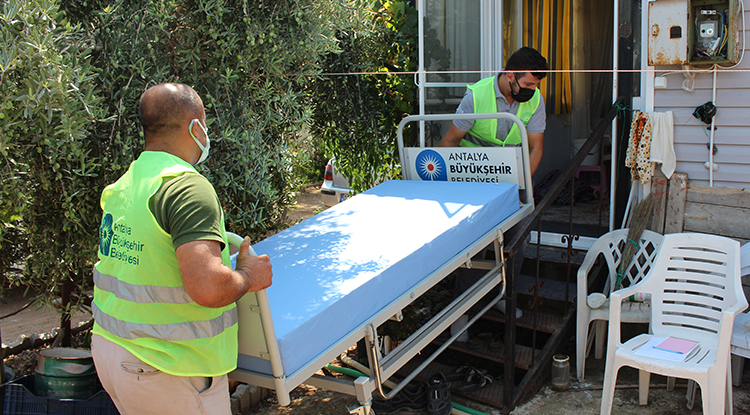 Geçirdiği kaza sonucu iki bacağı da kırılan ve yatarak tedavi gören 35 yaşındaki vatandaş ile Kumluca Beykonak Mahallesi'nde ankiloz ve beyin küçülmesi nedeniyle 2 yıldır yatağa bağımlı olan bir kişiye tam donanımlı hasta yatağını teslim etti. Hasta yakınları fonksiyonlu hasta yatağı olmadığı için babasının bakımında çok zorlandıklarını belirterek Büyükşehir Belediye Başkanı Muhittin Böcek'e teşekkür etti. Çeşitli nedenlerle yürüyemez hale gelen vatandaşlara da tekerlekli sandalye desteğinde bulunan Antalya Büyükşehir Belediyesi Korkuteli Yeşilyayla Mahallesi'nde ikamet eden Ayşe Koyuncu'ya tekerlekli sandalye yardımı yaptı.