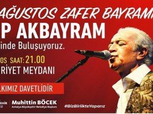 Zafer Bayramı coşkusu 30 Ağustos Cuma günü Cumhuriyet Meydanı’nda düzenlenecek Edip Akbayram ile yaşanacak. Saat 21.00’da başlayacak konserde usta sanatçı birbirinden güzel şarkıları ile kutlamaları renklendirecek.