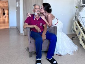 Antalya'da kızının düğününün ertelenmemesi şartıyla ameliyat olan ve kalpte tıkalı 3 ana damarı değişen babayı kızı hastanede gelinlikle ziyaret ederek sürpriz yaptı. Ziyaretle mutlu olan baba, kızının gelinlik kuşağını bağladı, genç çifte mutluluklar diledi. Hastanede duygusal anlar yaşandı.