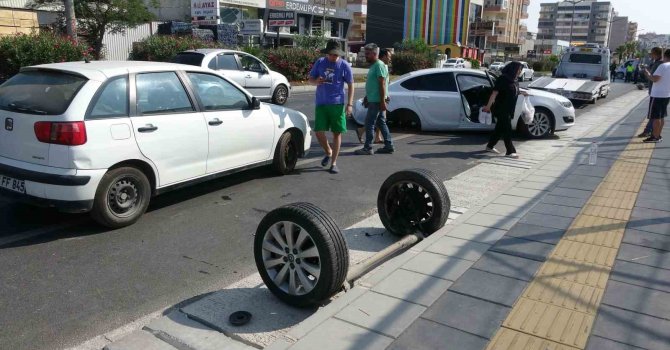Mersin'de meydana gelen trafik kazasında çarpışan otomobillerden biri ters döndü, diğerininin ise iki tekeri araçtan ayrıldı.