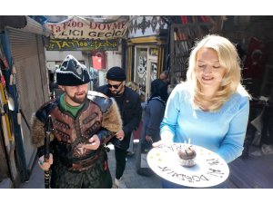 Kahramanmaraş'ın tarihi kapalı çarşısında Osmanlı kıyafetleri ile nöbet tutup adeta bölgenin vazgeçilmezi haline gelen down sendromlu Emre'ye doğum günü sürprizi yapıldı.