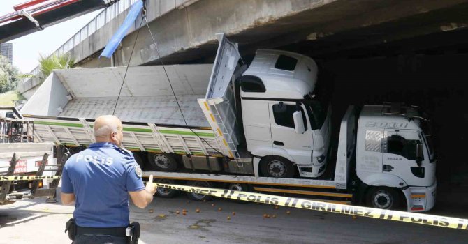Adana'da çekicinin üzerindeki kamyon otoyol köprüsüne sıkışınca trafik felç oldu.