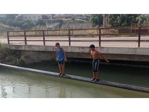 Adana'nın Kozan ilçesinde yaz aylarının sıcağına dayanamayan çocuklar serinlemek için mahallerinden geçen kanallarda yüzerek vakit geçiriyor.