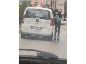 Canlarını hiçe sayan iki çocuk, paten üstünde hareket halindeki araca tutunarak dakikalarca seyahat etti.