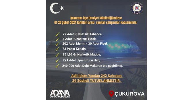 Adana Emniyet Müdürlüğü Çukurova İlçe Emniyet Müdürlüğüne bağlı, devriye ve araştırma ekipleriyle, çarşı mahalle bekçileri halkın güvenliğini sağlamak için 1-20 Şubat tarihleri arasında uygulama yaptı. Uygulamalarda durdurulan araçlarda yapılan aramalarda, 4 ruhsatsız tüfek, 27 ruhsatsız tabanca, silahlara ait 202 mermi ve 30 fişek ele geçirildi. Ayrıca silahların yanı sıra, 72 paket kokain, 151,99 gram uyuşturucu, 221 uyuşturucu hap 240 bin dolu makaron ele geçirilirken çeşitli suçlardan aranan 242 şahıs yakalandı. Yakalanan şahıslardan 29'u çıkarıldığı mahkemede tutuklandı.