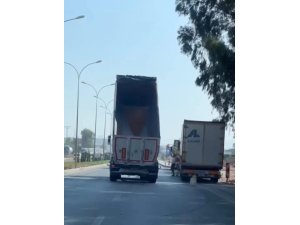 Hatay'da sürücüsünün damperini açık unuttuğu hafriyat kamyonunun metrelerce yol gittiği anlar cep telefonu kamerasına yansıdı.