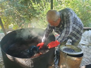 Samandağ'ın Kapısuyu Mahallesi'nde defne yağı çıkaran Ahmet Balcı, "Defne yağı yaparken ilk önce defne tanesini koyuyoruz sonra ölçülü şekilde suyunu koyuyoruz ve gece kazanın altını yakıyoruz ve kaynamaya bırakıyoruz. Sabah olunca kazanın içindeki meyveleri ezip yağını alıyoruz" dedi.