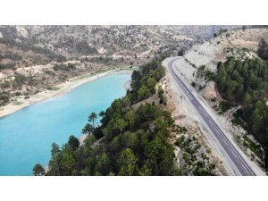 Kahramanmaraş'ta dağların arasında bulunan ve turkuaz rengiyle mest eden Değirmendere Göleti, görenleri kendine hayran bırakıyor.