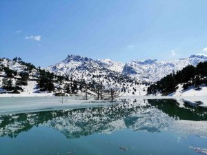 Göksun ilçesi Değirmendere Göleti'nin yüzeyi buzla kaplandı. Doğa tutkunları ise eşsiz manzaralarla karşılaştı.