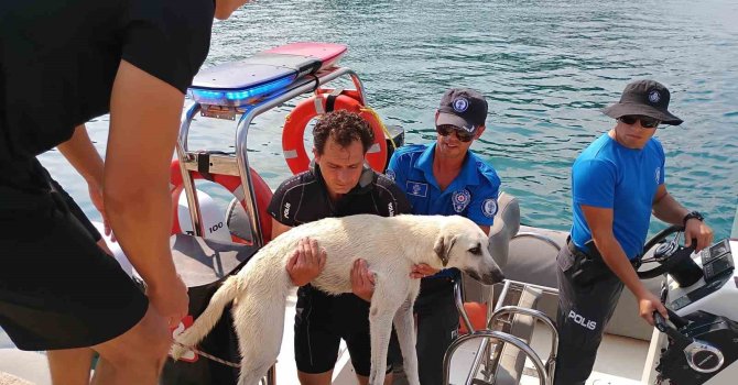 Antalya'da yaklaşık 30 metrelik falezlerin dip noktasında ki kayalık alanda mahsur kalan sokak köpeği deniz polisi tarafından kurtarıldı.