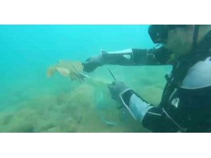 Dalış ekipleri, deniz altında ağlara takılı halde buldukları balığı ağlardan kurtararak özgürlüğüne kavuşturdular.