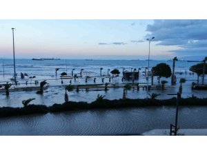 Hatay'ın İskenderun ilçesinde şiddetli yağış ve fırtınanın etkisiyle depremle birlikte yaklaşık 1 metreyi bulan çökmenin yaşandığı sahil şeridi sular altında kaldı.