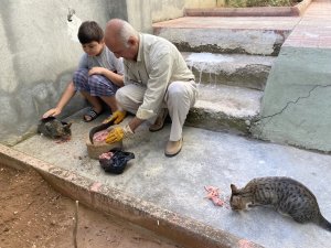 Kahramanmaraş'ta depremde bacağı kırılan anne kedi ve yavru kediyi kendi imkanları ile tedavi edip iyileştiren dede ile torunu, iki kediye gözleri gibi bakıyor.