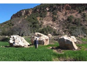 Kahramanmaraş'ta 7,7 büyüklüğündeki depremin merkezi Pazarcık ilçesinde ekili tarım arazilerine tepeden kopan tonlarca ağırlığındaki kayalar, felaketin büyüklüğünü tekrar gözler önüne serdi.