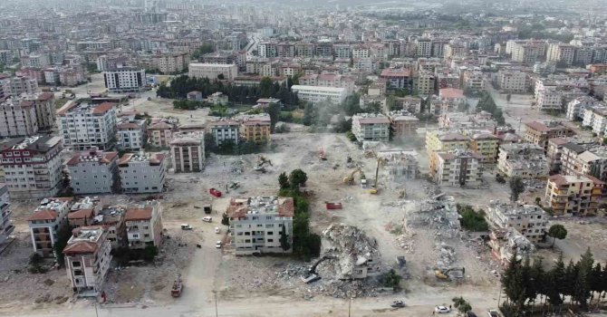 6 Şubat Kahramanmaraş merkezli depremlerden en çok etkilenen Hatay'ın, merkez Antakya ve Defne ilçelerindeki 82 mahallede, ağır hasar gören binaların yıkımı ve enkazı yerinde dönüştürme çalışmaları devam ediyor. Yıkılan binaların demirleri beton parçalarından ayrılıp, iş makineleri ile kamyon ve tırlara yükleniyor. Kamyonlara yüklenen molozlar ise belirlenen döküm alanlarına götürülüyor. Yıkım çalışmaları dron ile de görüntülendi.