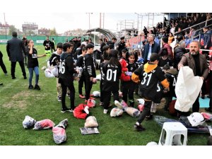 Antalya'da Kepezspor ile Siirt İl Özel İdaresi Spor karşılaşmasında taraftarlar deprem bölgesindeki çocuklara gönderilmek üzere sahaya oyuncak attı.