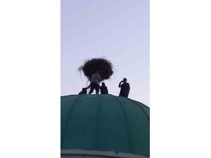 Osmaniye'de iki kez trafik kazası nedeni ile elektrik direklerindeki yuvası yok olan, bu kez de deprem de ağır hasar alan cami minaresi yıkılacağı için evsiz kalacak olan göçmen leyleğin yuvası kurtarıldı.