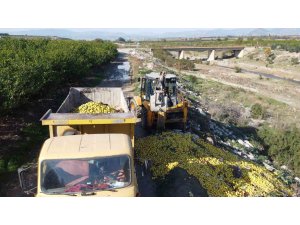 Adana'nın Kozan ilçesinde dere yatağına dökülen tonlarca limon, iş makineleri ile kamyonlara yüklenerek imha edildi.