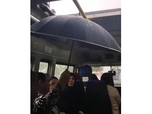 Adana'da dolmuş şoförü havalandırmayı açık bırakınca bir kadın yolcunun yağan yağmurdan korunmak için araç içinde şemsiye açması görenleri güldürdü.