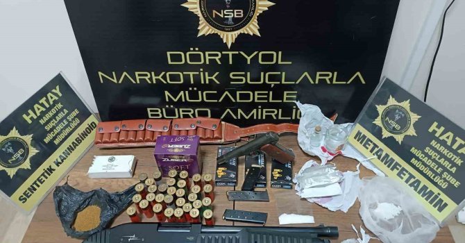Hatay Emniyet Müdürlüğü görevlilerince uyuşturucu imal ve ticaretine yönelik yapılan çalışmalar sonucunda Dörtyol Özerli mahallesinde bulunan İ.E. isimli şahsın ikametinde yapılan aramada; 18,1 gr Metamfetamin, 1 adet Sentetik Ecza, 11,02 gram Sentetik Kannabinoid, 1 adet 7,65 mm çapında tabanca, 2 adet ruhsatsız silah, 129 adet 7,65 mm, 26 adet 9,19 mm, 57 adet 12 mm fişek ele geçirildi.