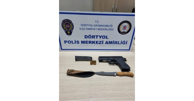 İl Emniyet Müdürlüğü görevlilerince kentte asayişin sağlanması amacıyla çalışmalar aralıksız sürüyor. Yürütülen çalışmalar kapsamında Dörtyol ilçesi Numune Evler Mahallesi'nde durumundan şüphelenilerek durdurulan A.E.K.'nın yapılan üst aramasında 1 adet tabanca, 1 adet şarjör, 8 adet fişek ve 1 adet bıçak ele geçirildi.