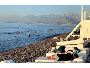 Turizm kenti Antalya'da nemli ve sıcak hava etkisini devam ettiriyor. Hava sıcaklığının 30, nem oranının yüzde 85'i aştığı kentte hissedilen sıcaklık değeri ise artıyor. Evlerde klima altında uyumak istemeyen vatandaşların adresi de sahiller oldu. Günün tüm saatlerinde tatilcileri ağırlayan Konyaaltı sahilinde bazı vatandaşların kalabalık arasında uyumaya devam ettiği görüldü. Bazı vatandaşların yastıkla, bazılarının havluyla uyuduğu, bazılarının ise arkadaşlarıyla yan yana yattıkları görüldü. Sıcak hava ve nemden dolayı gecenin ilerleyen saatlerinde sahile gelen vatandaşlar, buldukları boş bir noktada uyumayı tercih etti. İki kişinin ise plajda şezlonglar üzerinde uyudukları görüldü. Sabahın ilk ışıkları olmasına rağmen sahile gelenlerin yoğunluk oluşturduğu ve Akdeniz'in mavi sularında kulaç attıkları gözlemlendi.