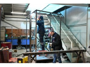 Lavabo ve tuvaletlerin üretimi için doğrama, birleştirme, boyama, kapı montajı ve elektrik aksamlarının bağlanması için 12 kişiden oluşan 5 ayrı ekip oluşturuldu. Kadın ve erkek olmak üzere 10 çift (20 adet) lavabo ve tuvalet üretimi hızla devam ediyor.