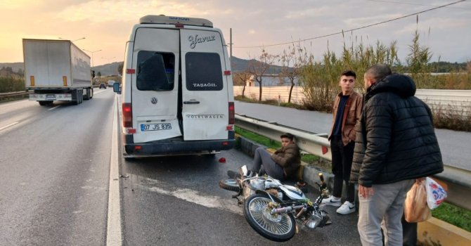 Kaza, Manavgat-Antalya D-400 kara yolu üzerinde gerçekleşti. Manavgat istikametinden Antalya yönüne ilerleyen Ö.C.T. (16) yönetimindeki 07 BZN 590 plakalı motosiklet, Gündoğdu Mahallesi Sarısu mevkisinde Hüseyin Güneş'in kullandığı 07 JS 835 plakalı yolcu minibüsüne arkadan çarptı. Çarpmanın etkisiyle yaralanan motosiklet sürücüsü, olay yerine sevk edilen 112 Sağlık ekiplerinin müdahalesinin ardından ambulansla Serik Devlet Hastanesi'ne kaldırıldı. Yaralının hayati tehlikesinin bulunmadığı bildirildi.