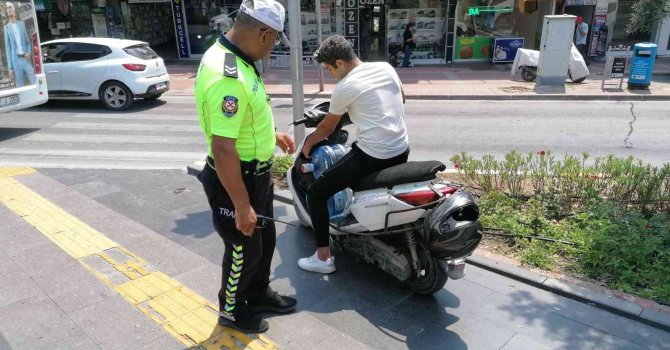 Manavgat'ta trafik ekiplerinin kask denetimlerinde su dağıtıcısı gencin kaskı başına değil motosikletin arkasına takması 7 bin 971 TL para cezasına mal oldu. Melih Can Kılinçli isimli genç, 2 gün önce de kask takmadığı için aynı cezayı yediğini belirterek, hava sıcak olduğu için kaskı olmasına rağmen takmadığını söyledi.