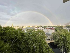 Kahramanmaraş'ın Elbistan ilçesinde kısa süreli yağışın ardından gökyüzünde çok nadir görülen doğa olaylarından biri olan çifte gökkuşağı oluştu.