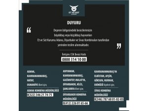 Et ve Süt Kurumu (ESK), depremden etkilenen üreticilerin sahipsiz kalmış veya bakım imkanı olmayan hayvanların mahallinden alındığını bildirdi.