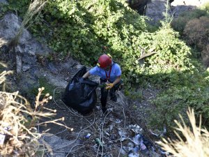 Muratpaşa Belediyesi, Akdeniz Üniversitesi (AÜ) Mağara Araştırma Kulübü üyeleriyle denizden yüksekliği yer yer 40 metreyi bulan falezlerde temizlik çalışması yaptı.