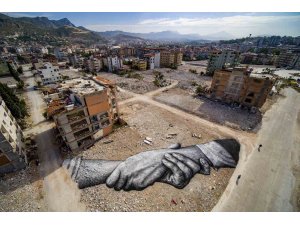 Asrın felaketinin yerle bir ettiği Hatay'da ünlü Fransız Arazi Sanatçısı Saype'nin dünyaya birlik ve beraberlik mesajı vermek amacıyla enkaz üzerine çizdiği dev eser, görünümüyle dikkat çekti.