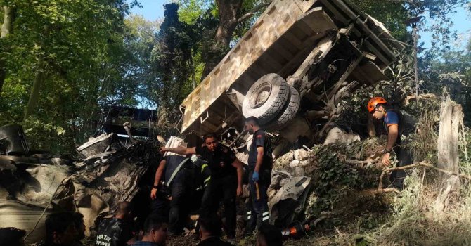 Hatay'ın Defne ilçesinde freni patlayan hafriyat kamyonu, uçurumdan yuvarlanarak güvenlik kulübesinin üzerine düştü. Kazada 1 kişi hayatını kaybetti, 1 kişi ağır yaralandı.