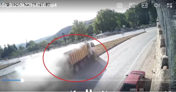 Hatay'ın Defne ilçesinde 1 kişinin öldüğü, 1 kişinin ağır yaralandığı kazada freni patlayan hafriyat kamyonunun kontrolden çıkarak tozu dumana kattığı anlar güvenlik kamerasına yansıdı.