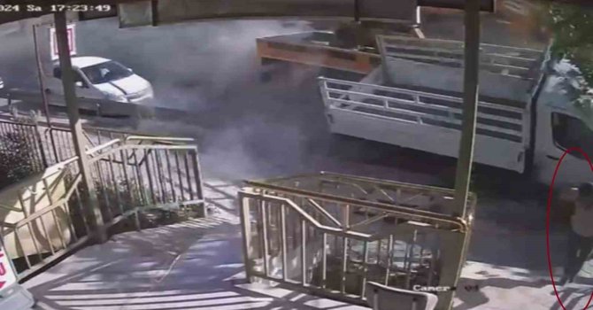 Hatay'da freni patlayan hafriyat kamyonunun araçları biçtiği anlar ve kaldırımda yürüyen bir vatandaşın ölümden saniyelerle kurtulduğu anlar güvenlik kamerasına yansıdı.