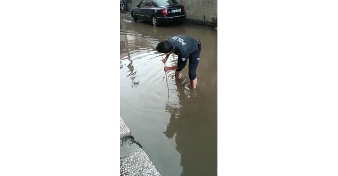 Adana'da gece saatlerinde başlayan sağanak yağış sabahın ilk saatlerine kadar devam etti. Sağanak yağış nedeniyle bazı mahallelerde sokaklar su altında kaldı. Bir komiserin, eline aldığı çubuk ile su altında kalan sokağın giderini açmak için uğraştığı anlar cep telefonuyla görüntülendi.
