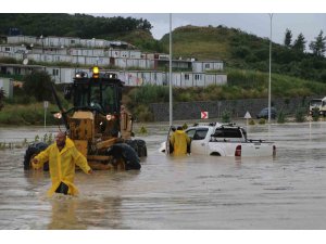 Hatay'da aşırı yağışla birlikte göle dönen yolda mahsur kalan araç büyükşehir belediyesi ekipleri tarafından kurtarıldı.