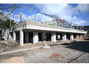 Kemer Belediye Başkanı Necati Topaloğlu'nun "Her mahalleye bir kapalı pazar yeri" projesi kapsamında Göynük Mahallesi'nde yapımı hızla devam eden kapalı pazar yerinde çalışmalar tamamlanmak üzere.