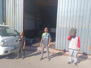 Antalya'nın Serik ilçesinde güneş tutulmasını izlemek isteyen sanayi esnafı kaynak gözlüklerini kullandı.