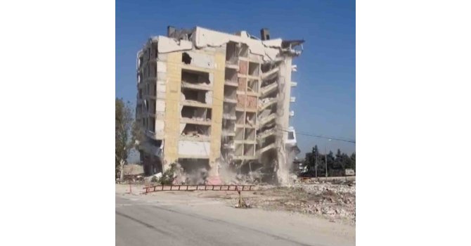 Kahramanmaraş merkezli depremlerde büyük yıkım yaşayan Hatay'da enkaz kaldırma çalışmalarında sona gelindi. Antakya ilçesi Kavaslı Mahallesi'nde ağır hasarlı 8 katlı bina, iş makinesiyle zarar verildikten sonra halatla çekilerek yıkıldı. Kontrollü olarak gerçekleşen yıkımda herhangi bir olumsuzluk yaşanmadı. Binanın yerle bir olduğu anlar ise cep telefonu kamerasıyla görüntülendi.