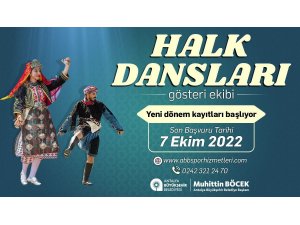 Antalya Büyükşehir Belediyesi tarafından 2022 yılı başında oluşturulan Halk Dansları Gösteri Ekibinin yeni dönem başvuruları başladı. Antalya Büyükşehir Belediyesi Halk Dansları Gösteri Ekibine başvurular 7 Ekim'e kadar www.abbsporhizmetleri.com üzerinden yapılabilecek.