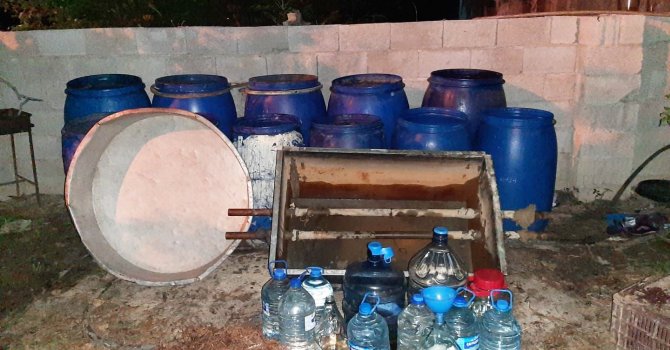 Ev ve eklentilerinde yapılan aramada bidonlar içerisinde toplam 3 bin 550 litre sahte rakı ve 2 adet damıtma ünitesi ele geçirildi.