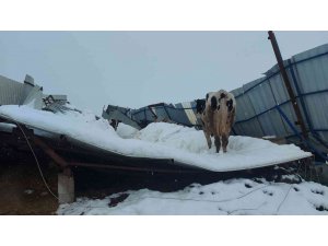 Hatay'ın Hassa ilçesinde etkili olan kar yağışı nedeniyle bir ahırın çatısı çöktü, içerisinde bulunan 180 büyükbaş hayvanın çoğunluğu enkaz altında kurtarılmayı bekliyor.