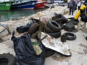 Hatay'ın Samandağ ilçesinde denizde yapılan dip temizliğinde sandalye ve araba lastikleri çıktı.