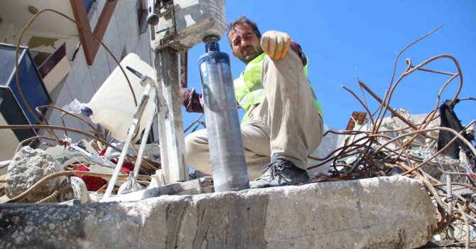 Kahramanmaraş merkezli depremlerin büyük yıkıma yol açtığı Hatay'da, enkaz kaldırma ile ölümlerin yaşandığı binalardan karot ve demir örnekleri alma işlemleri devam ediyor.