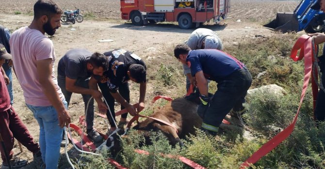 Hatay'ın Antakya ilçesinde kuyuya düşen buzağıyı itfaiye ekipleri kurtardı.