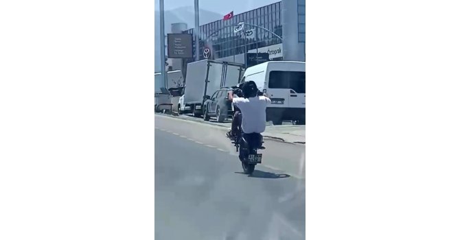 Olay, İskenderun-Antakya yolu üzerinde meydana geldi. Kimliği henüz belirlenemeyen motosiklet sürücüsü, trafikte seyir halindeyken ön tekeri havaya kaldırarak uzun süre bu şekilde ilerledi. Sürücünün bu tehlikeli gösterisi yolda seyreden başka bir araçtakiler tarafından cep telefonu kamerasıyla kaydedildi. Görüntülerde, motosikletlinin yoğun trafikte yaptığı hareketle hem kendi hayatını hem de çevredeki diğer sürücüleri riske attığı açıkça görülüyor. Trafik kurallarını hiçe sayan sürücünün kimliğinin tespit edilip, gerekli işlemlerin yapılması için yetkililerin çalışma başlattığı öğrenildi.